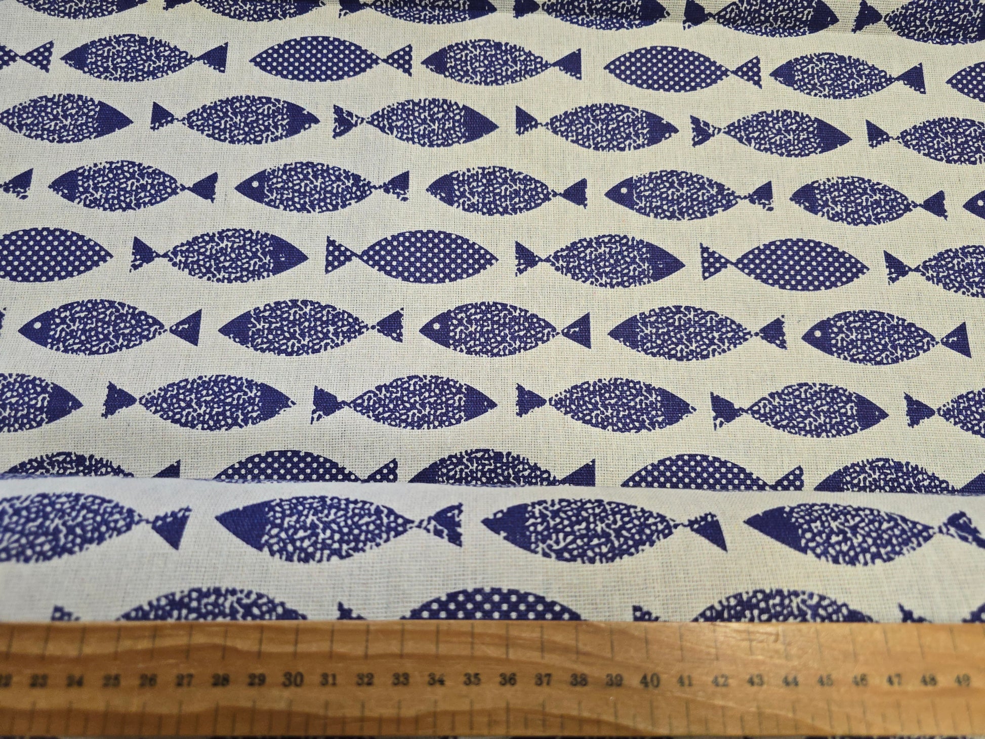 Dive into this charming cotton-mix canvas featuring playful swimming fish across a soft natural background. The delightful blue fish motifs bring coastal charm and whimsy to your sewing projects on a versatile neutral base.