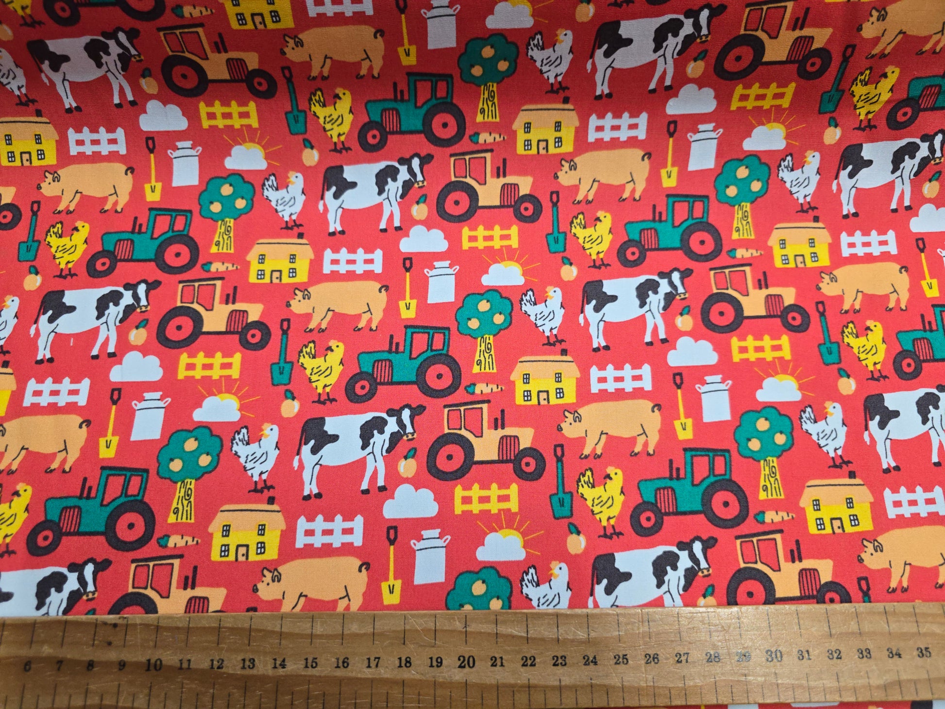 Rose and Hubble Farm Yard in Red - Tractors, Cows & Pigs 100% Cotton Poplin Fabric - 112cm Wide